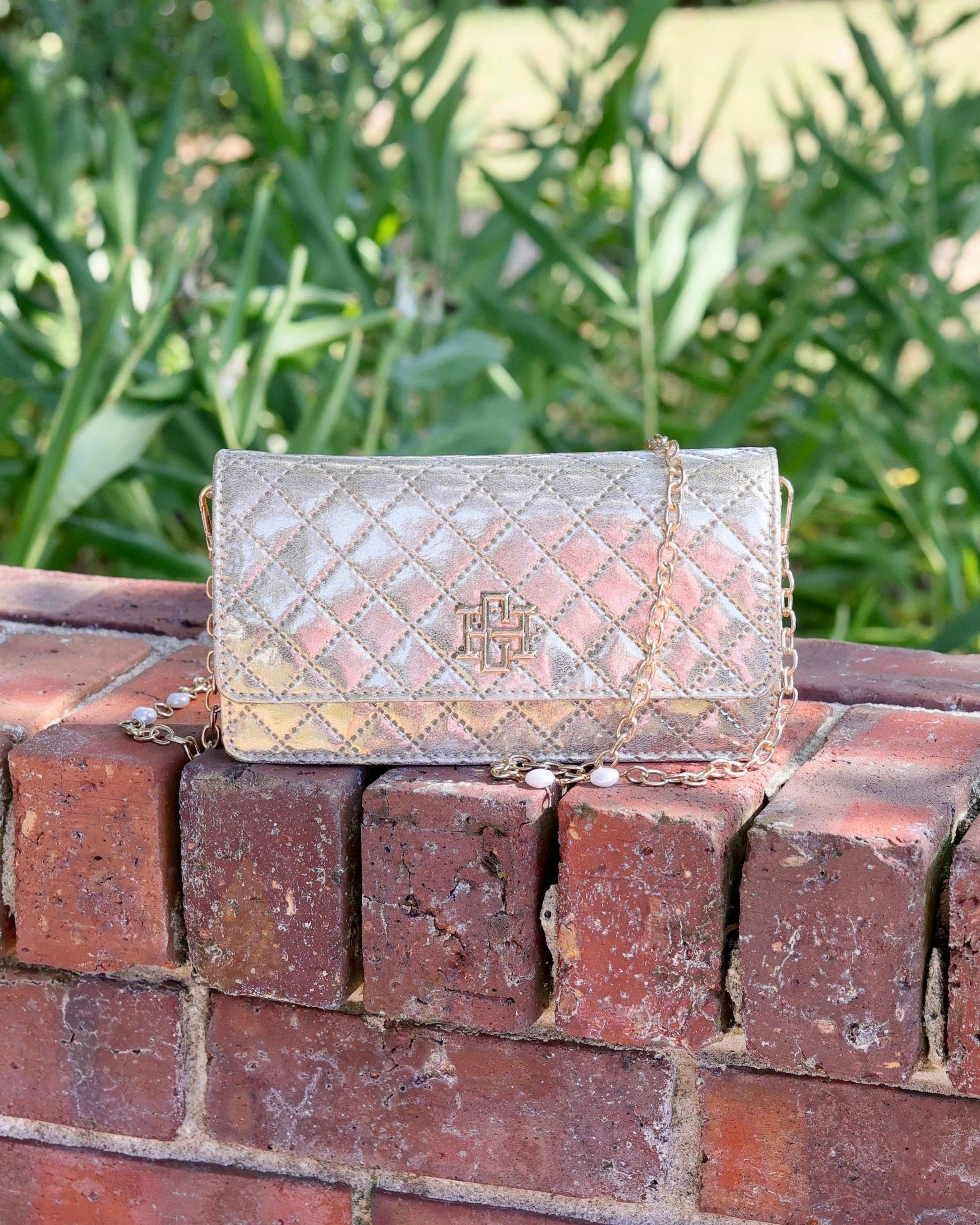 This stylish textured metallic vegan leather handbag is a great statement piece. It has a gold link crossbody strap featuring subtle accent pearls for a classy touch. The strap is removable so the bag can be carried as a fashionable clutch as well. It has a front magnetic flap that features the Caroline Hill logo, and the vegan leather interior has two separate sections with card slots to keep you organized when using.