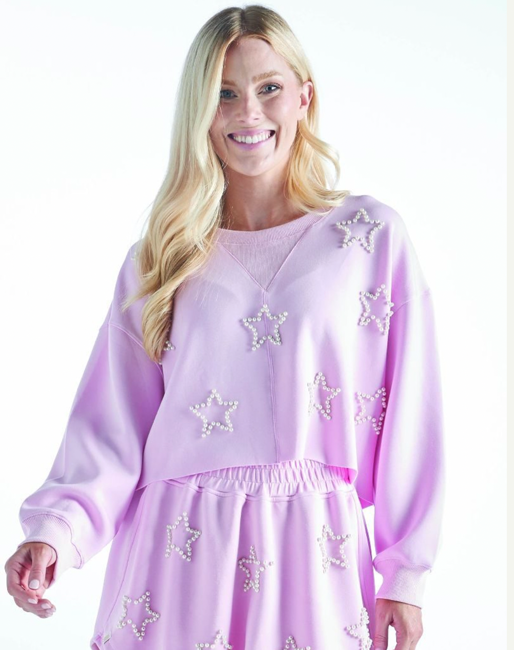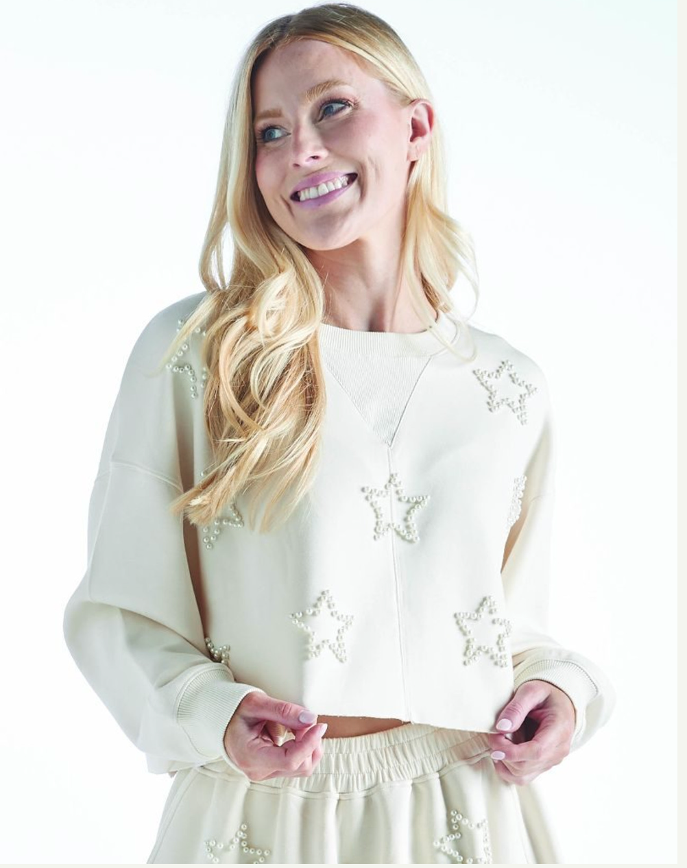 Relax and lounge in this comfortable Piper Pullover. It features faux pearl star outlines, rib neck and cuffs, cropped fit and Simply Southern logo label at hem. Made of 48% modal 48% polyester 4% spandex.
