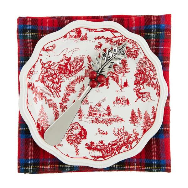 Celebrate the festive season with the Holly Appetizer Set, a charming 3-piece collection perfect for holiday gatherings. The set includes a beautifully crafted stoneware appetizer plate, measuring 6 1/2" in diameter, ideal for serving your favorite snacks and treats. Accompanying the plate is a stainless steel spreader, featuring a delightful cast aluminum Santa handle, adding a touch of whimsy to your table setting. The set is completed with a patterned hand towel, sized at 26" x 16 1/2", made from a soft and durable blend of 70% polyester, 21% cotton, and 9% rayon, ensuring both style and functionality. This appetizer set is not only a practical addition to your holiday entertaining but also a festive accent that brings joy and cheer to your home.