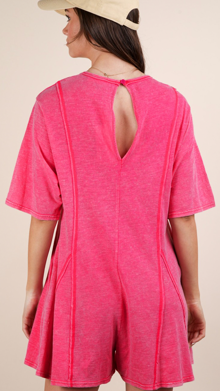 - Mineral Washed Oversized Knit Comfy Romper - Round Neck - Drop Shoulder - Short Sleeve - Raw Edge Detail - Back Keyhole