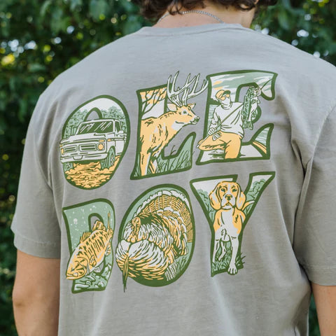 Celebrate the Ole Boy lifestyle with this rugged tee featuring a bold back print showcasing iconic images like a truck, deer, turkey, fishing, and a trusted dog—all cleverly displayed within the letters. Built for comfort and pride, it’s perfect for anyone who lives the Ole Boy way every day.