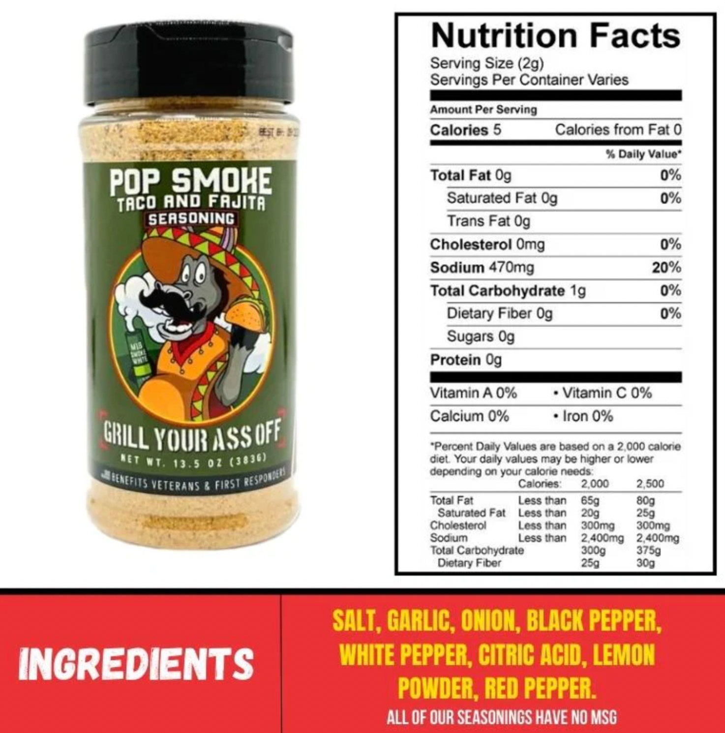 The most requested seasoning is here! Pop Smoke puts expertamente (“expertly” for you Yankees) blended spices right at your fingertips to give you that authentic Tex-Mex flavor. For an additional mouthwatering taste boost, our Pop Smoke Taco and Fajita Seasoning is the right choice for you. Savor the blend of tangy citrus and the aroma of fragrant herbs mixed into this product. With key ingredients, such as citric acid & lemon powder, you will not only get an amazing flavor but it will also help soften muscle fibers for a more tender cut of meat! Enhance your party's nachos, fajitas, tater tots, or tacos, and turn it into a fiesta. Now, let’s Pop Smoke and get grillin’!