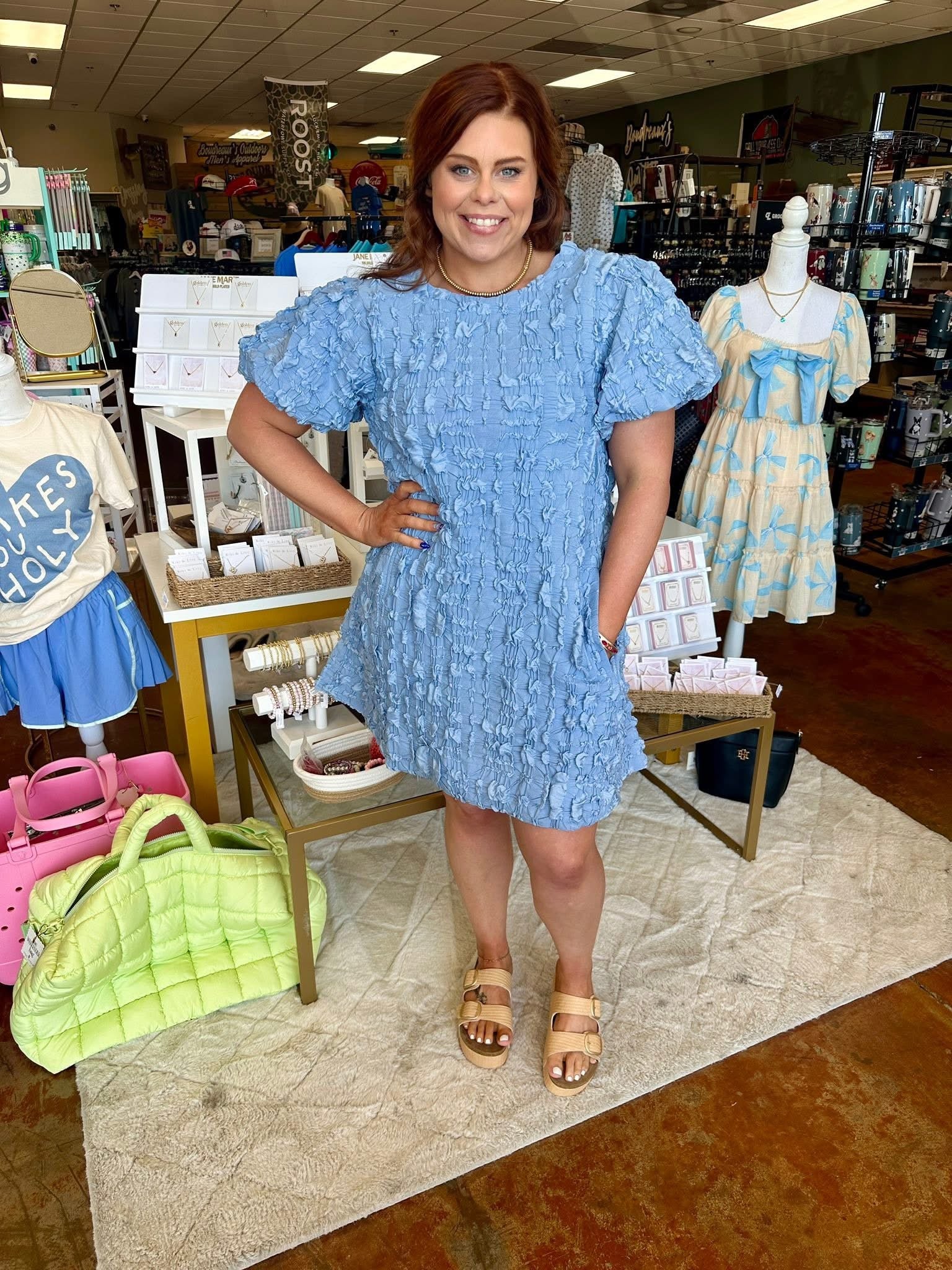 Textured Round Neck Mini Dress-Blue